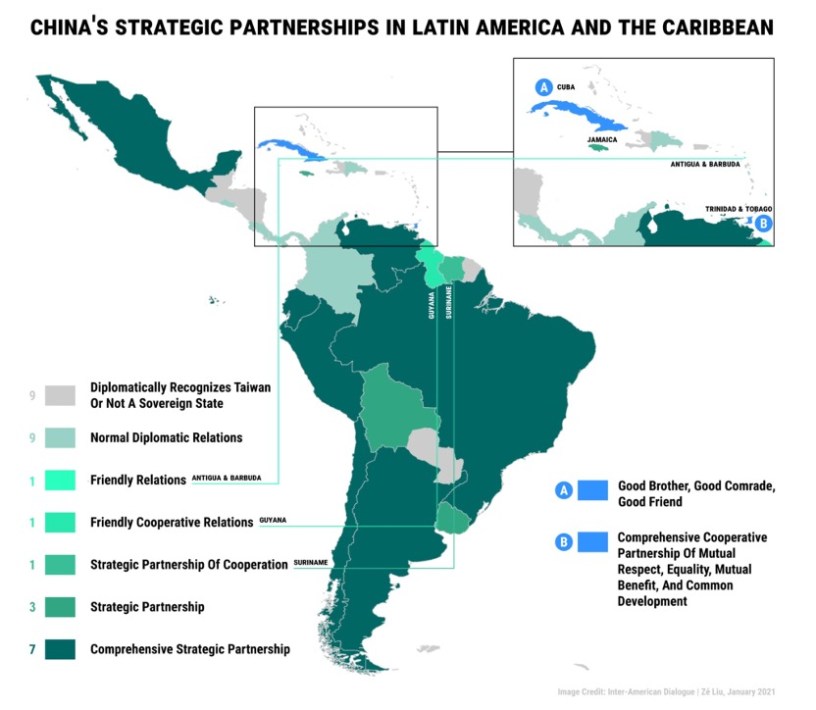 至少有三个拉美国家享有不被世界上任何其他国家共享的特殊地位。第一个是古巴,其经常被称为中国的“好兄弟,好同志,好朋友“,这反映了中古特殊双边关系的历史与政治基础。特立尼达和多巴哥与中国保持着“相互尊重、平等互利、共同发展的全面合作伙伴”关系,这一关系由“互利发展的友好合作关系”逐步发展而来。虽然牙买加在过去享有“共同发展的友好伙伴关系”的独特称号,两国于2019年建立了战略伙伴关系,使得中牙关系与中国的全球战略伙伴关系体系保持一致。苏里南的“战略合作伙伴关系”仅与韩国和孟加拉国共享。
